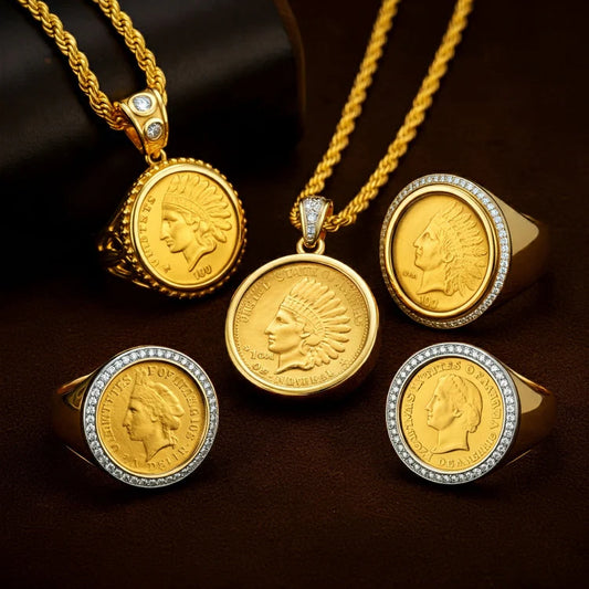 Diamond Fancy Solid Gold Handmade Coin Ring , Indian Head Coin ,