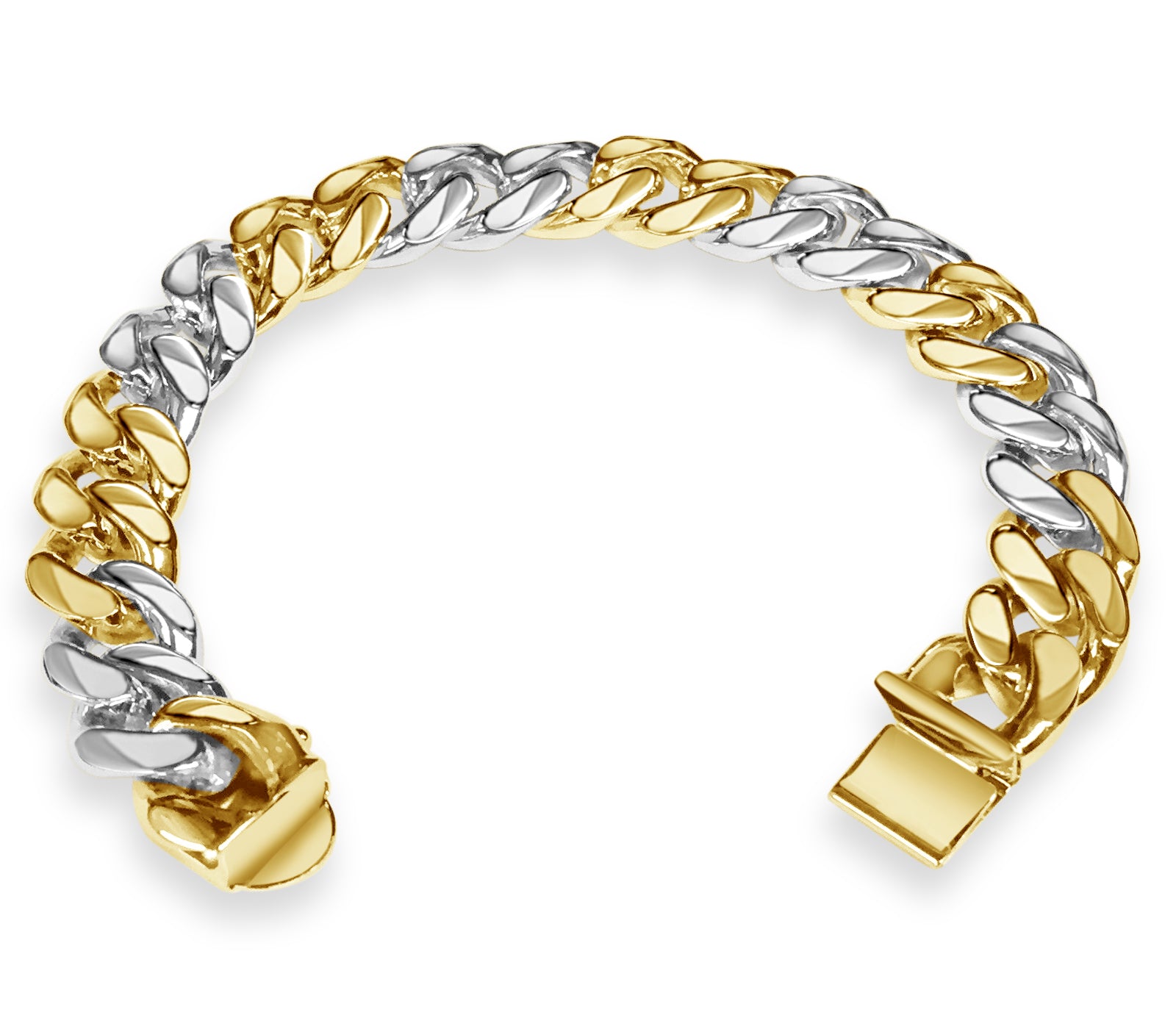 Crafted with precision by our seasoned artisans, each link of this bracelet tells a story of heritage and tradition. Available in 10K, 14K, or 18K gold, with a dimension of 13mm, it strikes the perfect balance between boldness and refinement. Choose from multiple gold colors such as; Yellow, White, Rose, Two-Tone, or Tri-Color to suit your style.