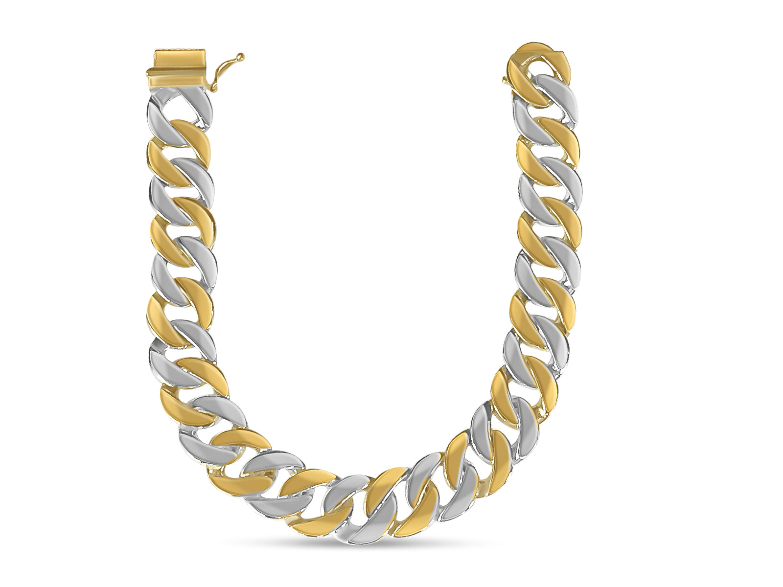 Crafted with precision by our seasoned artisans, each link of this bracelet tells a story of heritage and tradition. Available in 10K, 14K, or 18K gold, with a dimension of 14mm, it strikes the perfect balance between boldness and refinement. Choose from multiple gold colors such as; Yellow, White, Rose, Two-Tone, or Tri-Color to suit your style.