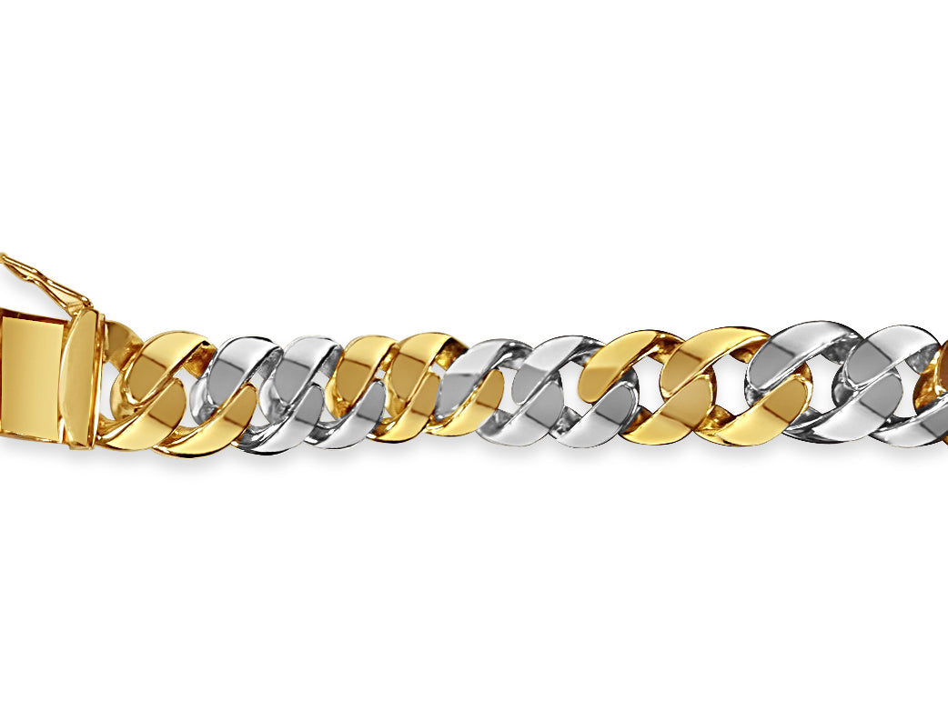 Crafted with precision by our seasoned artisans, each link of this bracelet tells a story of heritage and tradition. Available in 10K, 14K, or 18K gold, with a dimension of 15mm, it strikes the perfect balance between boldness and refinement. Choose from multiple gold colors such as; Yellow, White, Rose, Two-Tone, or Tri-Color to suit your style.